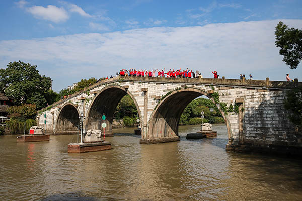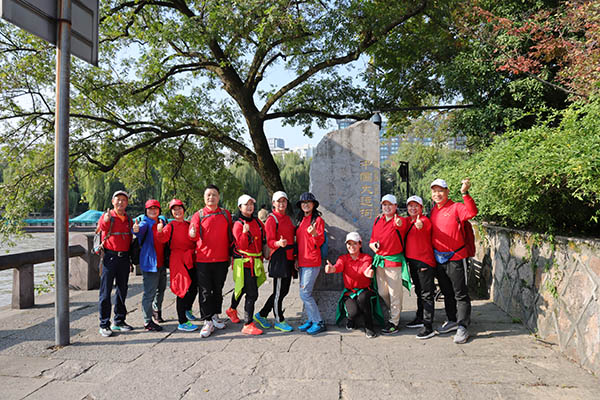 一大早,100多人的徒步队伍从诸暨出发,前往杭州西湖文化广场。上午8点30分,徒步队伍从西湖文化广场正式出发,一路沿着京杭大运河运道,过老德胜桥、霞湾公园,大兜路历史文化街区、京杭大运河杭州景区,行至全国重点文物保护单位拱宸桥,过桥进入桥西历史街区,再沿运道折返回起点,全程约14公里。正值秋高气爽,运河两岸杨柳依依,既有古色古香,又见城市繁华。客轮、货轮在运河中来回穿梭,繁忙又惬意。新开放的小河公园里游人如织,富义仓等一众旧址在诉说曾经。